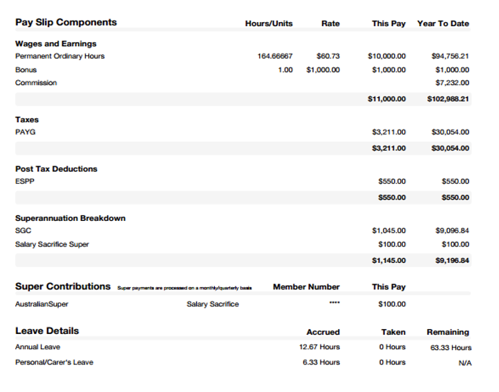 Payslips must include gross and net pay, PAYG withheld, super contributions, and leave balances. These can be provided electronically or in hard copy within 1 business day of pay date.