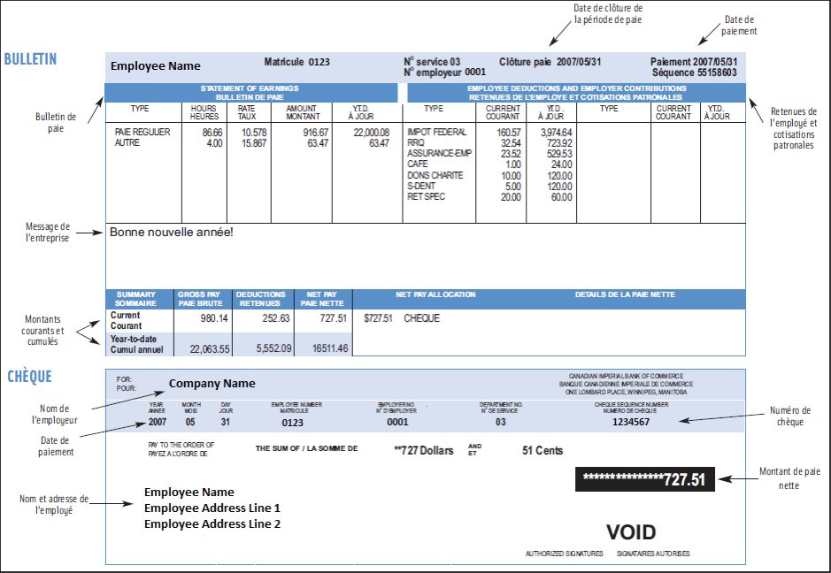 - Canadian payroll systems must accommodate both English and French languages for pay slips.