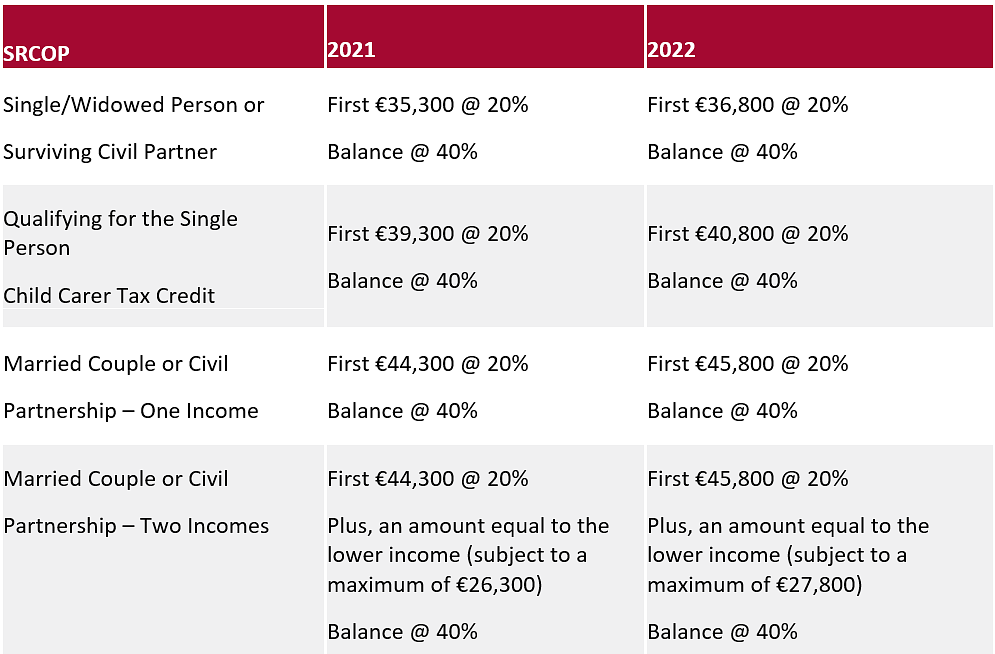 The Standard Rate Cut-Off Points (SRCOPs) have been increased for 2022: