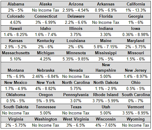 Income tax: At a federal level, employers in the US are required to withhold income tax, at source, from their employees - and report those taxes to the IRS. Most states and some localities also levy income taxes, and impose withholding obligations on employers. Federal income tax rates in the US are progressive, and are charged at rates ranging from 10%-37%. Just as with the federal income tax system, most states use a progressive tax system, though some have a flat tax rate and others actually have no income tax at all.